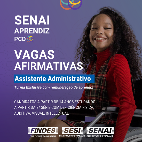 Ao ofertar o curso Assistente Administrativo no modelo Aprendiz PCD, com turma exclusiva de vagas afirmativas para Pessoas com Deficiência, a Findes e o Senai têm o objetivo de preparar mão de obra capacitada e promover mais oportunidades para pessoas com deficiência conquistarem uma carreira e inserção no mercado no mercado de trabalho.