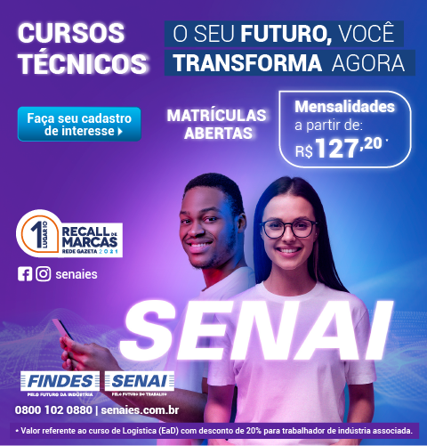 As vagas estão divididas entre as unidades Senai de Aracruz, Cachoeiro de Itapemirim, Colatina, Linhares, Serra (Civit), Vila Velha (Araçás) e Vitória. O Senai São Mateus oferece apenas os cursos da modalidade de Ensino a Distância (EaD). Confira os editais.