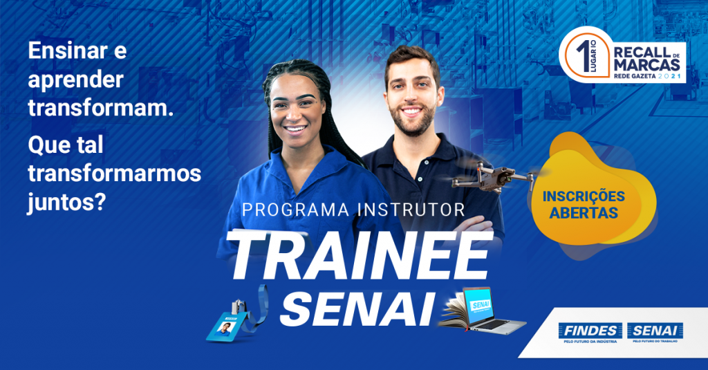 O Instrutor Trainee Senai foi desenvolvido pensando em quem acredita que a Educação é o melhor caminho para mudar realidades. As oportunidades são instrutor de Educação Profissional Básica em Automação, Metalmecânica ou Elétrica; além de instrutor de Educação Profissional Técnica em Automação, Metalmecânica, Elétrica e Tecnologia da Informação. Todas as vagas são para atuação na Grande Vitória. A carga horário do programa é de 40 horas e, além da remuneração, os candidatos terão benefícios como plano de saúde, ticket refeição e vale transporte. Não é necessário ter experiência em docência.