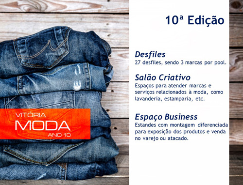 O mês de julho promete ser especial para a moda capixaba: afinal, entre os dias 11 e 13 de julho, ocorrerá o Vitória Moda – Ano 10, de 14h às 22 horas, no Centro de Convenções de Vitória, no bairro Santa Lúcia. O evento é uma iniciativa do Sistema Findes, em parceria com o Sesi-ES e o Senai-ES e correalização do Sebrae/ES.