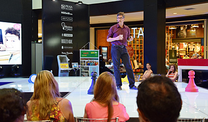 O especialista em gestão de pessoas Celso Simões apresentou sua palestra numa passarela, em meio a peças de tabuleiro gigantes