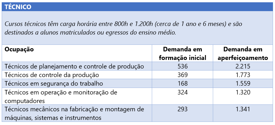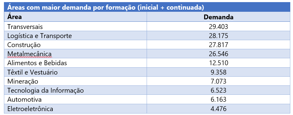 As áreas com maior demanda por formação são: Transversais, Logística e Transporte, Construção, Metalmecânica, e Alimentos e Bebidas. As ocupações transversais são aquelas que permitem ao profissional atuar em diferentes áreas, como técnico em Segurança do Trabalho, técnico de Apoio em Pesquisa e Desenvolvimento e profissionais da Metrologia, por exemplo.