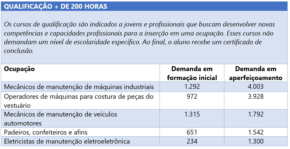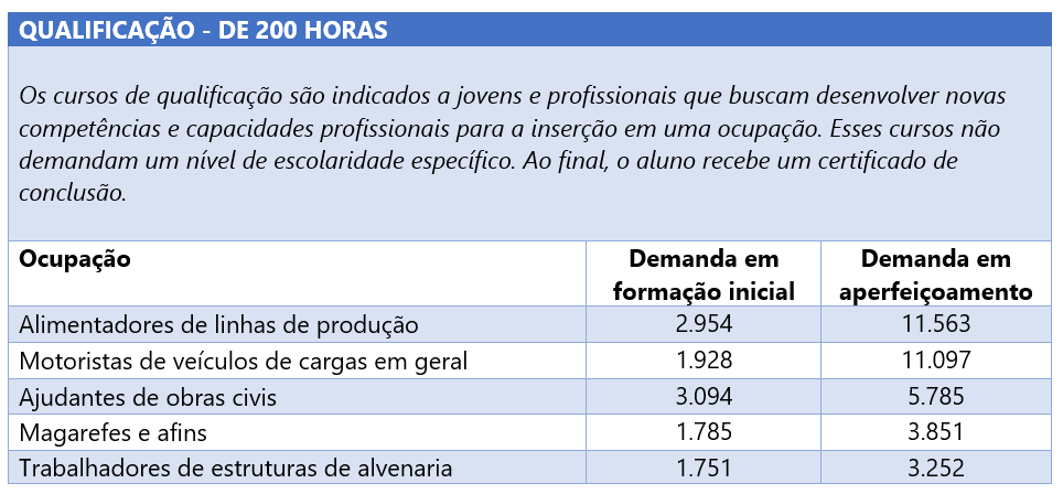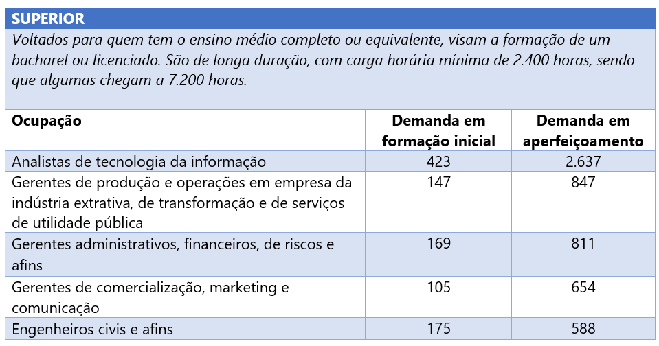 Abaixo, as ocupações com maior demanda por formação, agrupadas por nível de qualificação: superior, técnico, qualificação mais de 200 horas e qualificação menos de 200 horas: